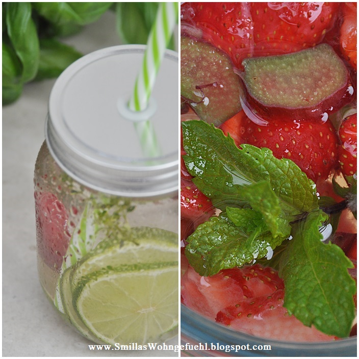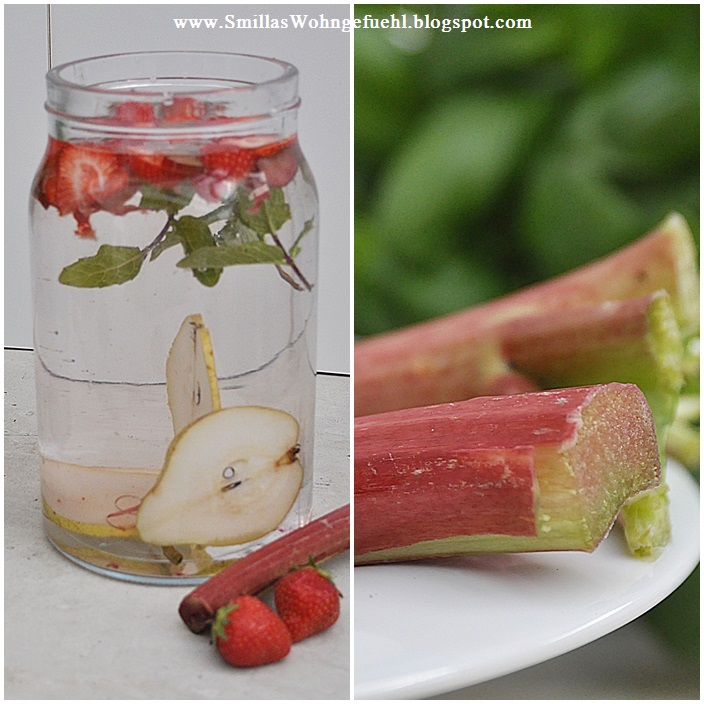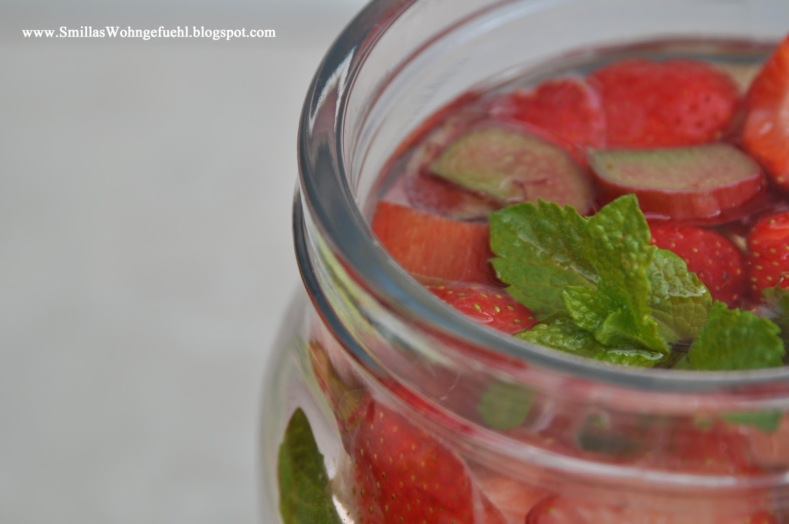 einmal Wasser mit Erdbeeren, Rhabarber, Birne und Minze