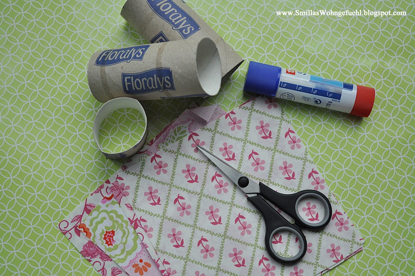 was man nicht alles aus den leeren Toilettenpapierrollen machen kann! Heute morgen habe ich schon bei Doreen auch eine sehr schöne Idee gesehen. Deine Servienttenringe finde ich toll! Der rosa Stoff passt super zu den grünen Servietten.