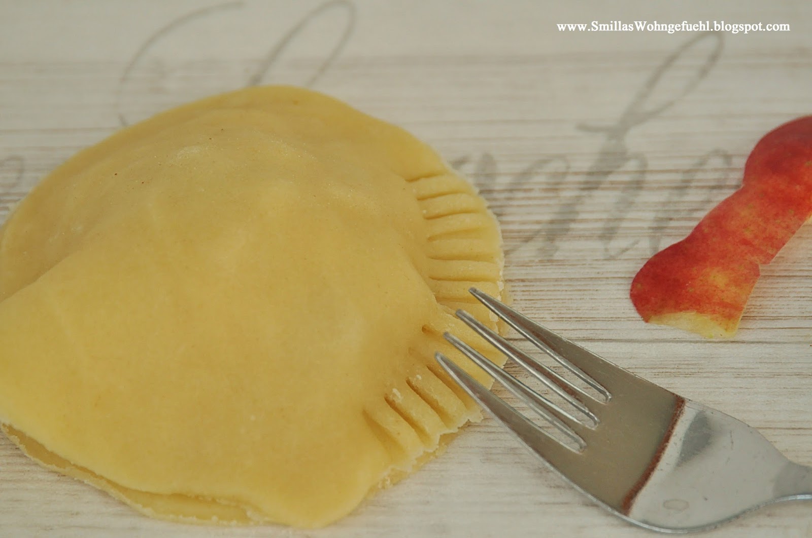 In die Mitte der Kreise nun die Füllung setzen und die Ränder mit Eiweiss einpinseln. Deckel drauf setzen und mit einer Gabel den Rand rundherum andrücken.