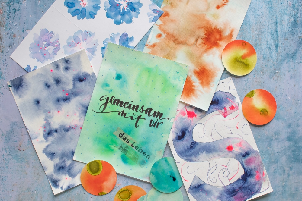 Zuerst gestaltet Ihr Euer Papier: dafür das Aquarellpapier mit einem nassen Pinsel (ohne Farbe) großzügig einpinseln. Jetzt nach und nach Farben darauf tropfen lassen oder mit einem eingefärbten Pinsel locker verteilen. Ihr könnt den Verlauf abmildern – falls mal zuviel Farbe an eine Stelle geraten ist – indem Ihr nochmals mit einem sehr nassen Pinsel darüber wischt. Danach die Papiere gut trocknen lassen.